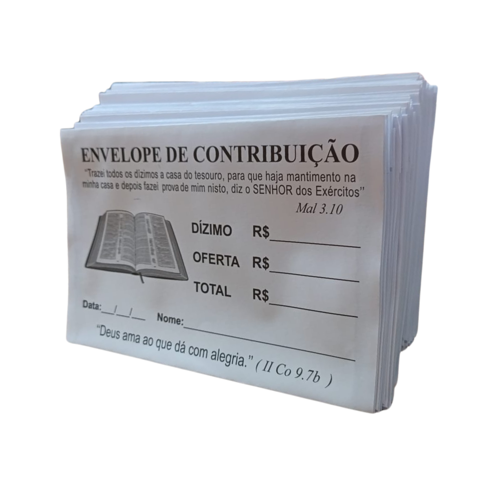 O Envelope para Dízimo, oferta e contribuição é um material para a Igreja. Este é um envelope médio e completo, que traz espaço para todas as informações necessárias, de uso único, trazendo assim privacidade para quem oferta, ao inserir seus dados diretamente no envelope apenas uma vez, com passagem bíblica no subtítulo e no rodapé além de verso liso.