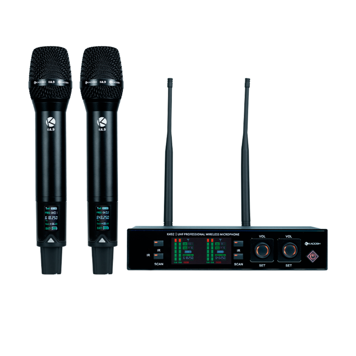 O Kadosh K492 é um sistema de microfones sem fio UHF profissional de nova geração, ideal para palestras e apresentações em ambientes de pequeno e médio porte. Possui tecnologia de alta performance com cápsulas dinâmicas e padrão polar cardióide, proporcionando áudio limpo e confiável. O receptor oferece saídas XLR e P10, com visor LCD iluminado. O sistema inclui microfones de mão e headset, com alcance de até 30 metros e até 8 horas de uso contínuo com pilhas AA.