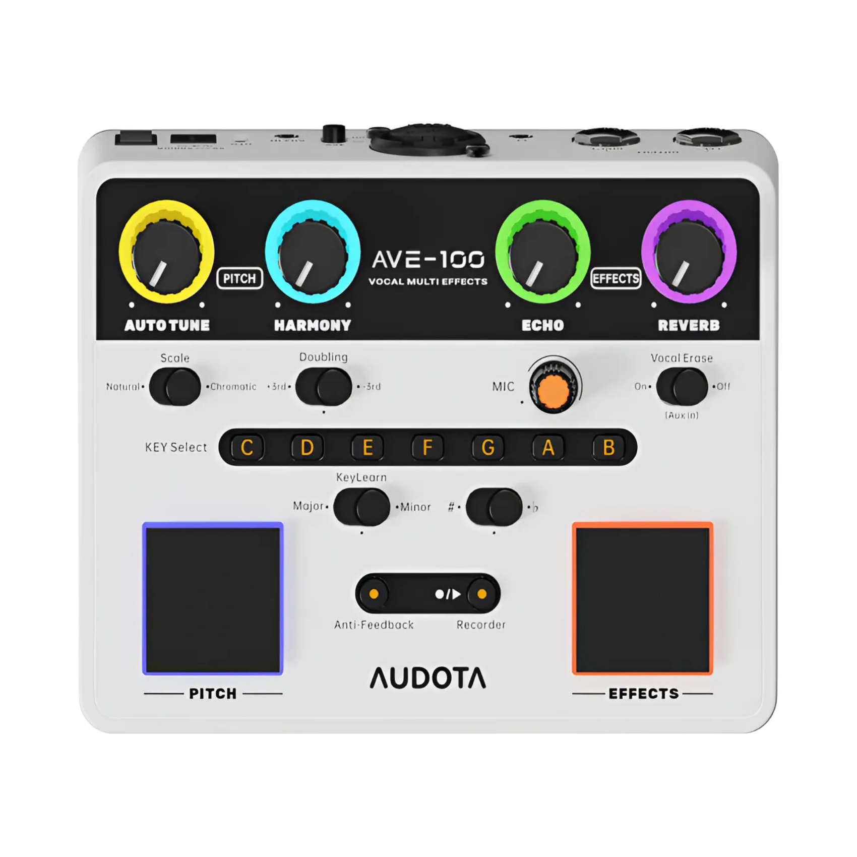 Transforme sua performance vocal com o AUDOTA AVE-100, um potente processador multiefeitos projetado para cantores destemidos. Controle o reverb, o delay e a correção de tom para esculpir seu som com precisão. Liberte três modos de harmonia distintos que se adaptam ao seu estilo, enquanto a detecção automática de tom mantém você no tom perfeito. Elimine os backing vocals com a função de cancelamento vocal — seja o centro das atenções em solos ou colabore com confiança.
